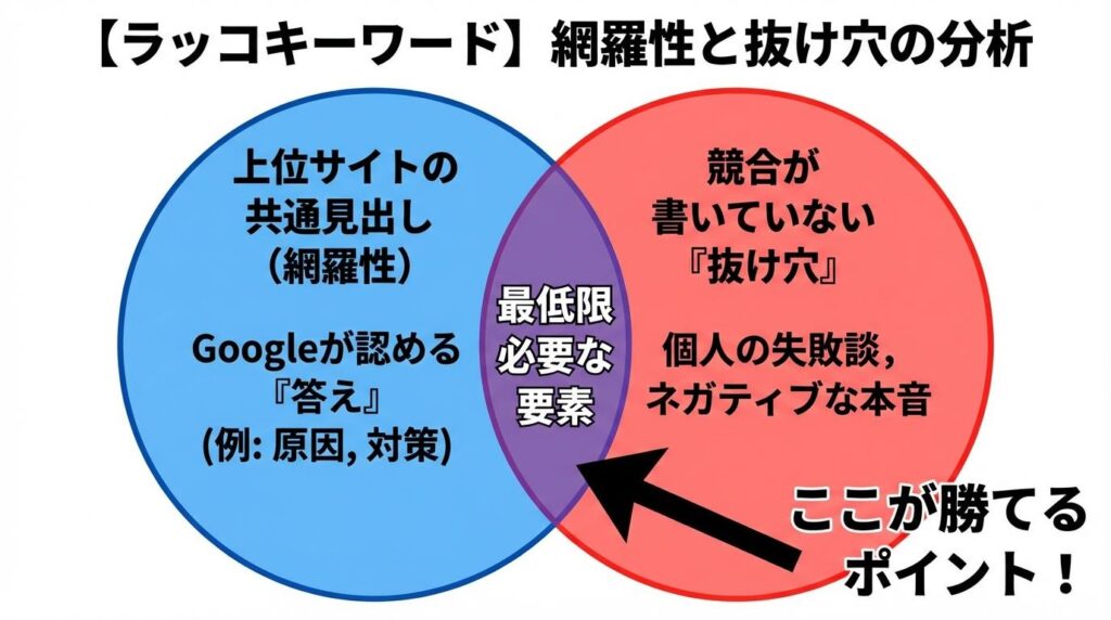 - 逆に、どの上位記事も書いていない「抜け穴」はどこか?