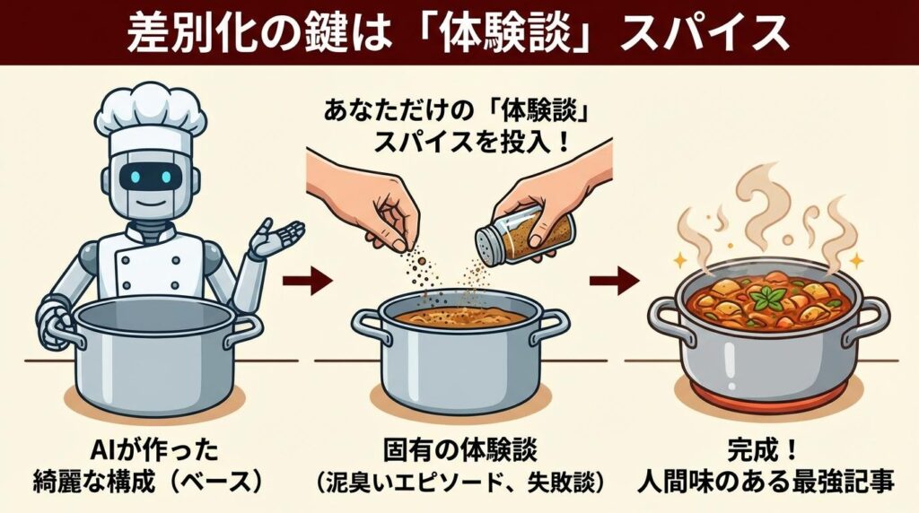 ここでもAIに本文を書かせてもいいですが、最後のスパイスだけは、必ず自分の手で入れてください。