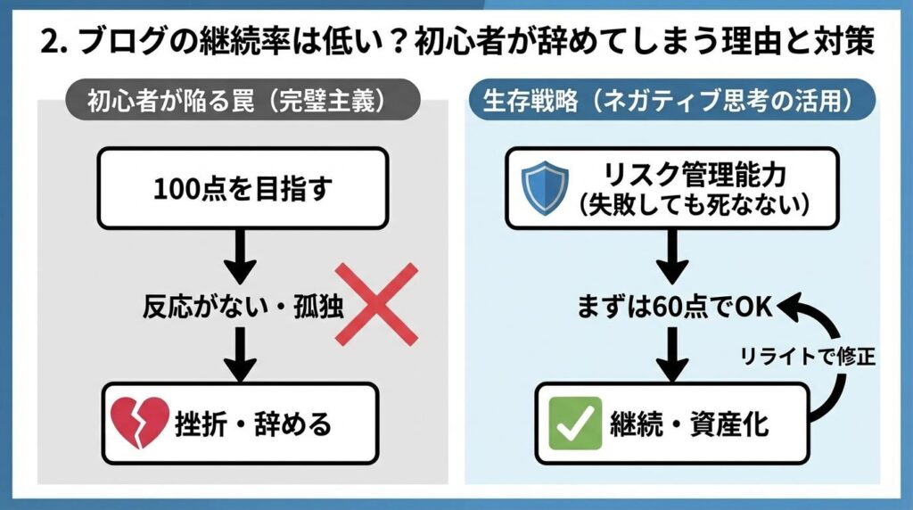 ブログの収益化には時間がかかると言いましたが、多くの人はその「成果が出ない期間」に耐えられずに辞めてしまいます。
