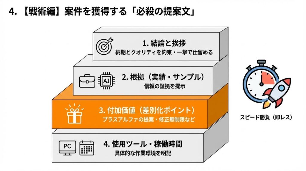 僕の場合だと、EC運営の経験があるので、「商品登録のついでに、売れるためのキャッチコピーも提案できますよ」と添えます。