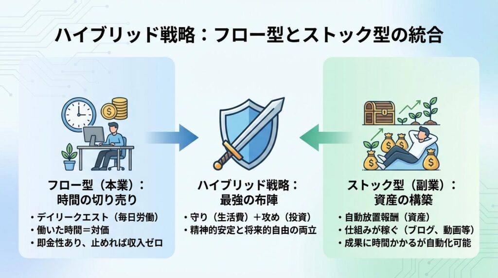 僕が提唱するのは、「フロー型(本業)」と「ストック型(副業)」のハイブリッド戦略です。