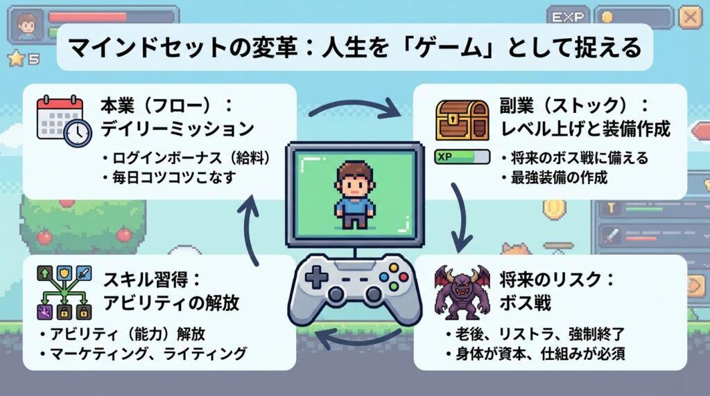 ・副業(ストック): レベル上げと最強装備の作成。将来のボス戦(老後やリストラ)に備えるための準備。
