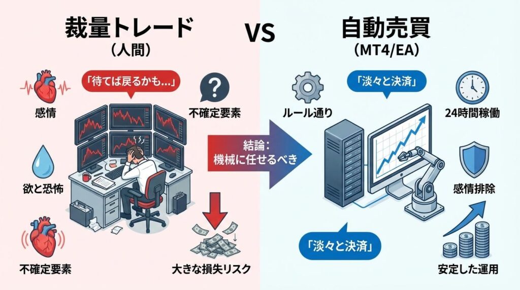 まず、僕がなぜ手動でのトレード(裁量トレード)ではなく、MT4を使った自動売買にこだわっているのか。