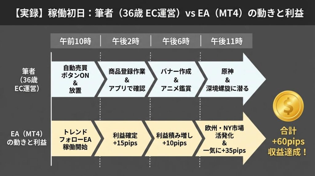 初日に60pips勝てたのは、たまたま相場がEAのロジックに噛み合ったからです。