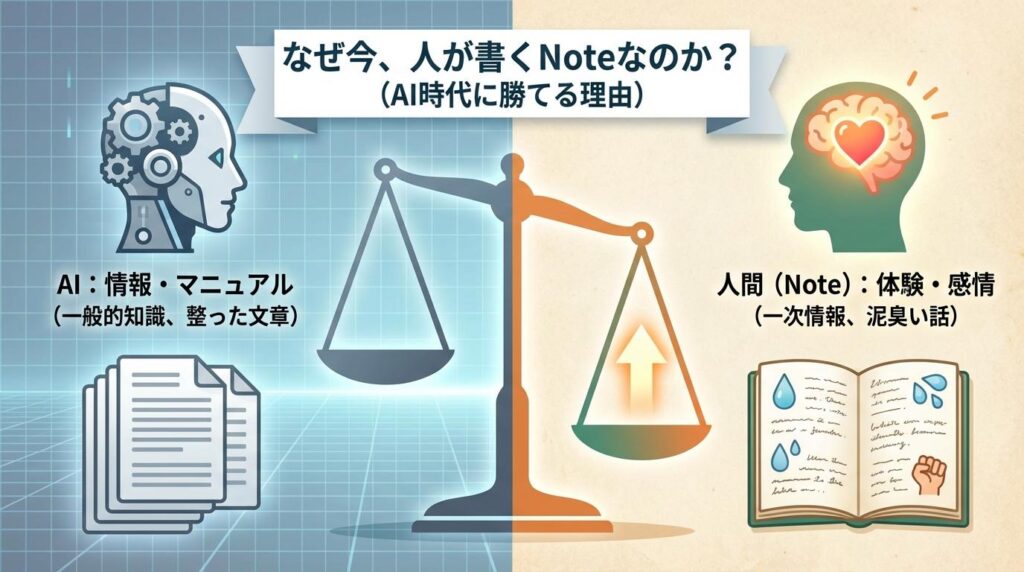 ネット上の情報がAI製のもので溢れれば溢れるほど、読み手は「本物の人間が書いた、泥臭い話」を求めるようになります。